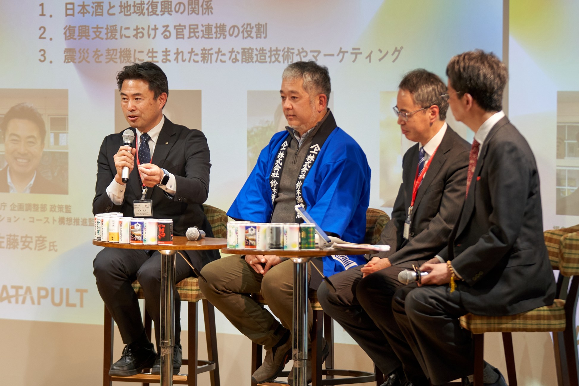 日本酒の消費拡大と文化醸成、さらには知識としての教養を広めることを目的に、TIB CATAPULT「SA&Fクラスター」の一環としてイベントを開催しました。当日は業界関係者のみならず、異業種の方々にもご参加いただき、多角的な視点から日本酒の魅力や可能性を再認識する機会となりました。第2回目の開催では、自走的な運営体制を整えることができ、本プロジェクトが確立へと進展しています。今後は物品販売や復興支援とも連動させ、より広がりのある取り組みとして発展させてまいります。